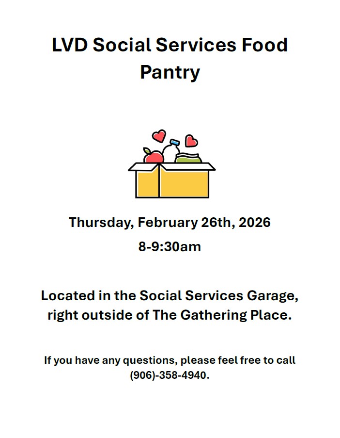 The Gathering Place Transfer Station Road, Watersmeet, MichiganThe LVD Social Services Pantry will be open on Thursday, February 26th from 8:00 - 9:30 AM. The poster below has additional information about the opportunity.