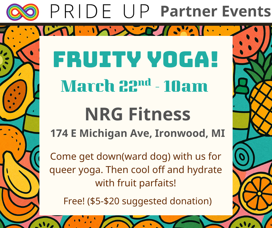 NRG Fitness 174 E Michigan Ave, Ironwood, MISupport the 2026 Ironwood Area Pride events by attending Fruity Yoga. Details on the poster below.