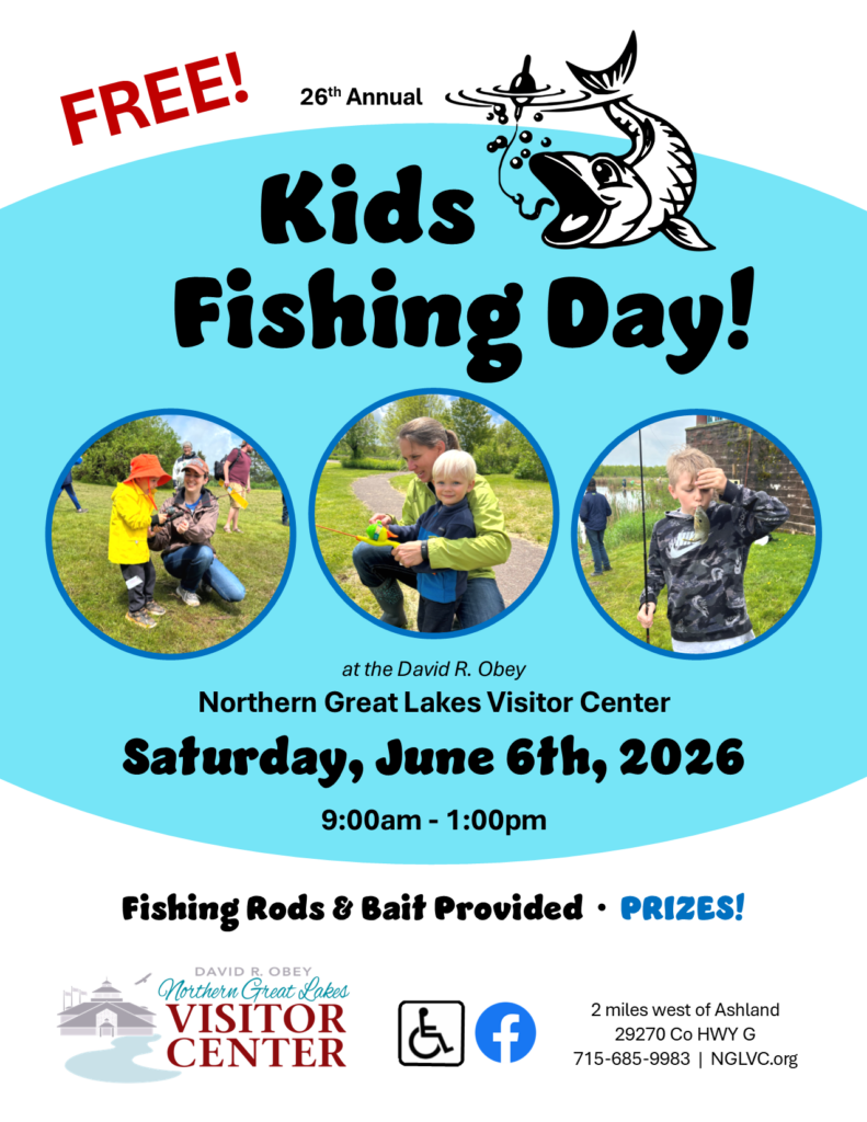 Join us on Saturday, June 6th for the 26th annual Kids Fishing Day, from 9:00am to 1:00pm at the David R. Obey Northern Great Lakes Visitor Center.