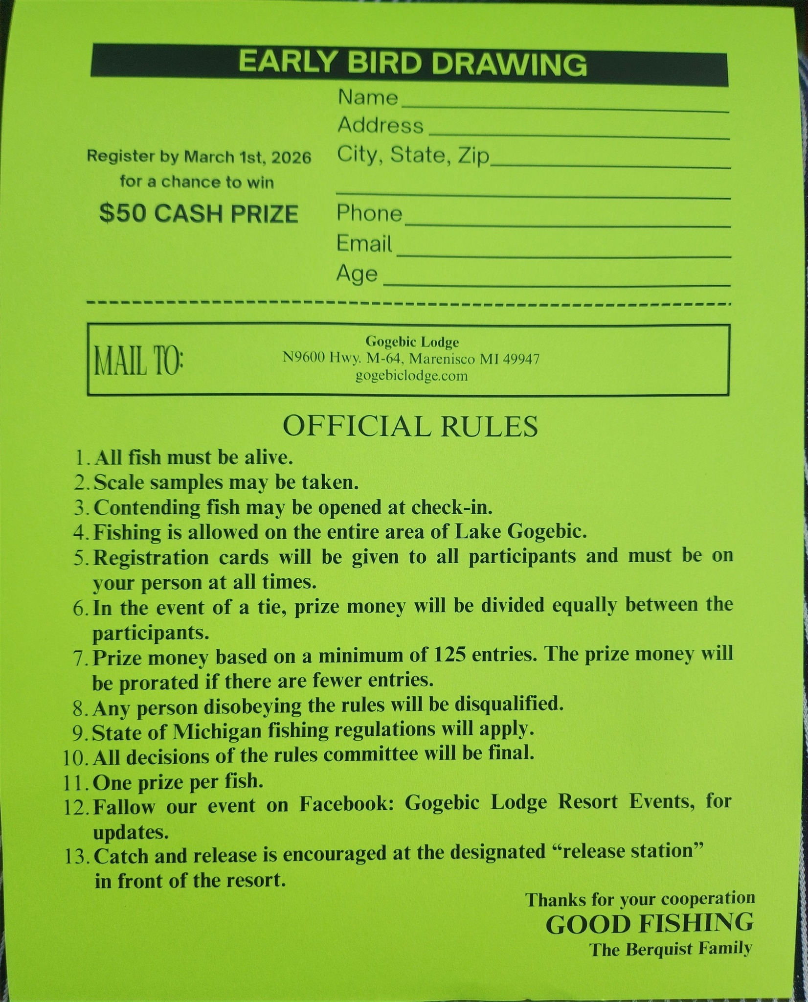 To Register, Mail pre-registration, see attached, or stop in main Lodge to sign up. Enjoy a Day on Beautiful Lake Gogebic. !