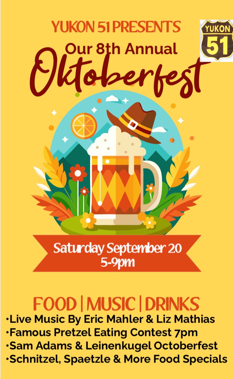 Be a part of the pretzel eating contest, enjoy FREE live music and celebrate the season at Yukon 51’s Oktoberfest.