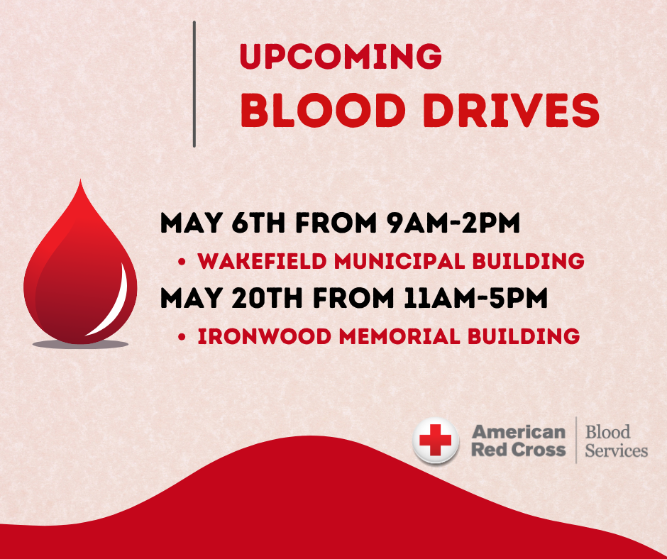 There will be an American Red Cross Blood Drive at the Ironwood Memorial Building on Wednesday, May 20h from 11AM – 5 PM.