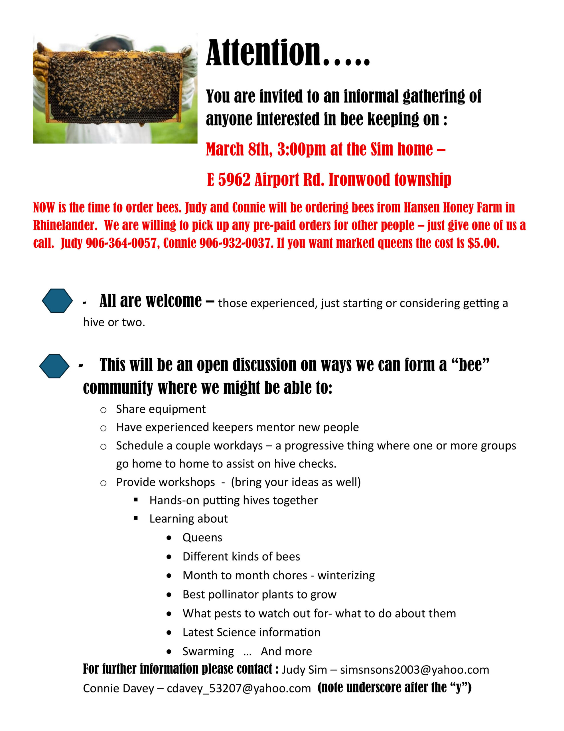 Join the group at the Sim home and location of their local bee keeping business on Sunday, March 8th at 3 PM.