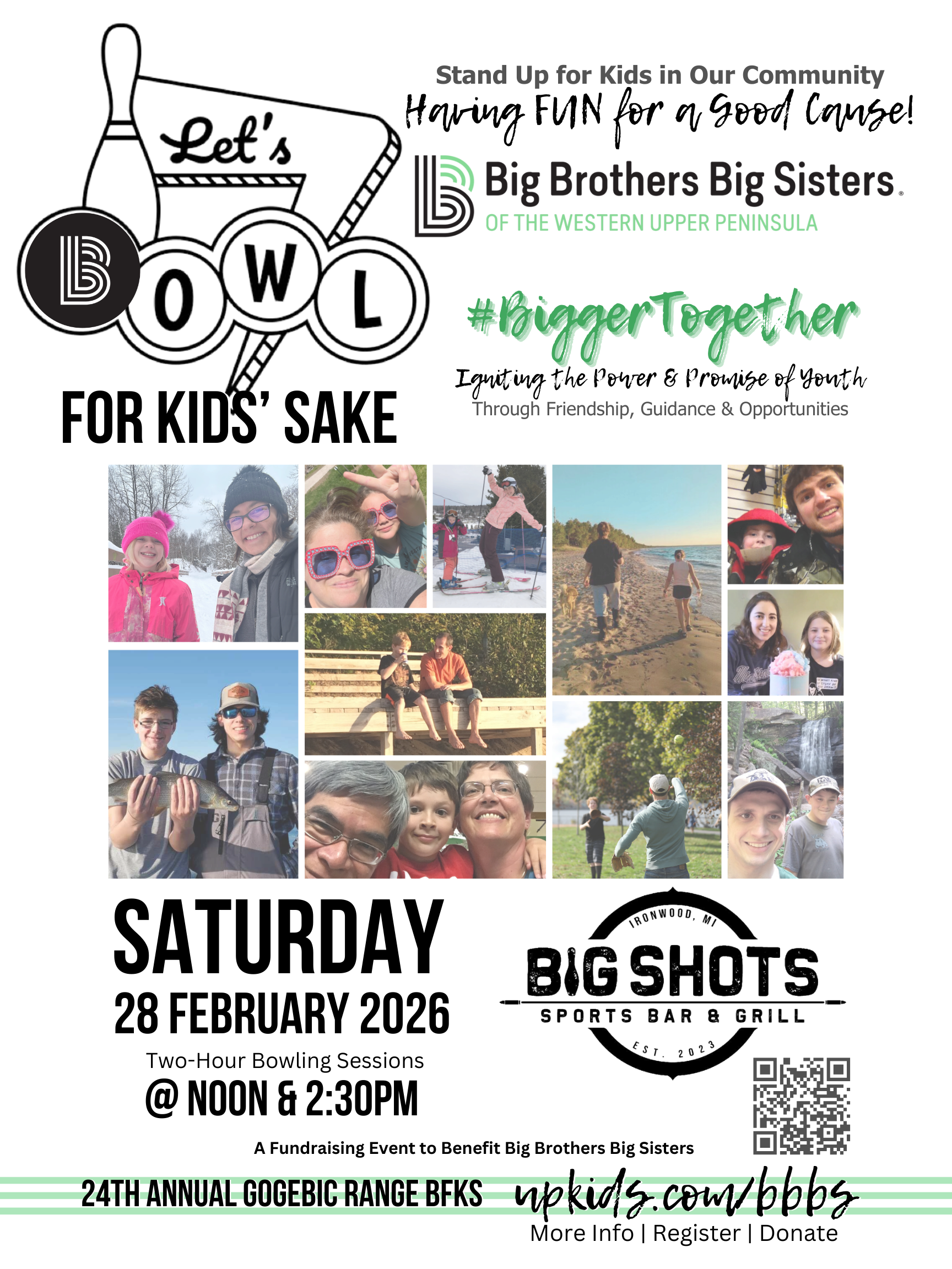 A fundraising event to benefit the local Big Brothers Big Sisters mentoring programs for youth… The 24th Annual Gogebic Range Bowl for Kids’ Sake is not about the bowling. It’s about Having FUN for a Good Cause… Defending the Potential of children and youth in your community! It’s also the signature fundraising campaign that your local Big Brothers Big Sisters sponsors each year. The purpose of the event is to invite the community to stand up for kids and be a part of the Big Brothers Big Sisters’ Mission by raising funds for local mentoring programs for children and youth. All of the money raised stays right here in the local communities!