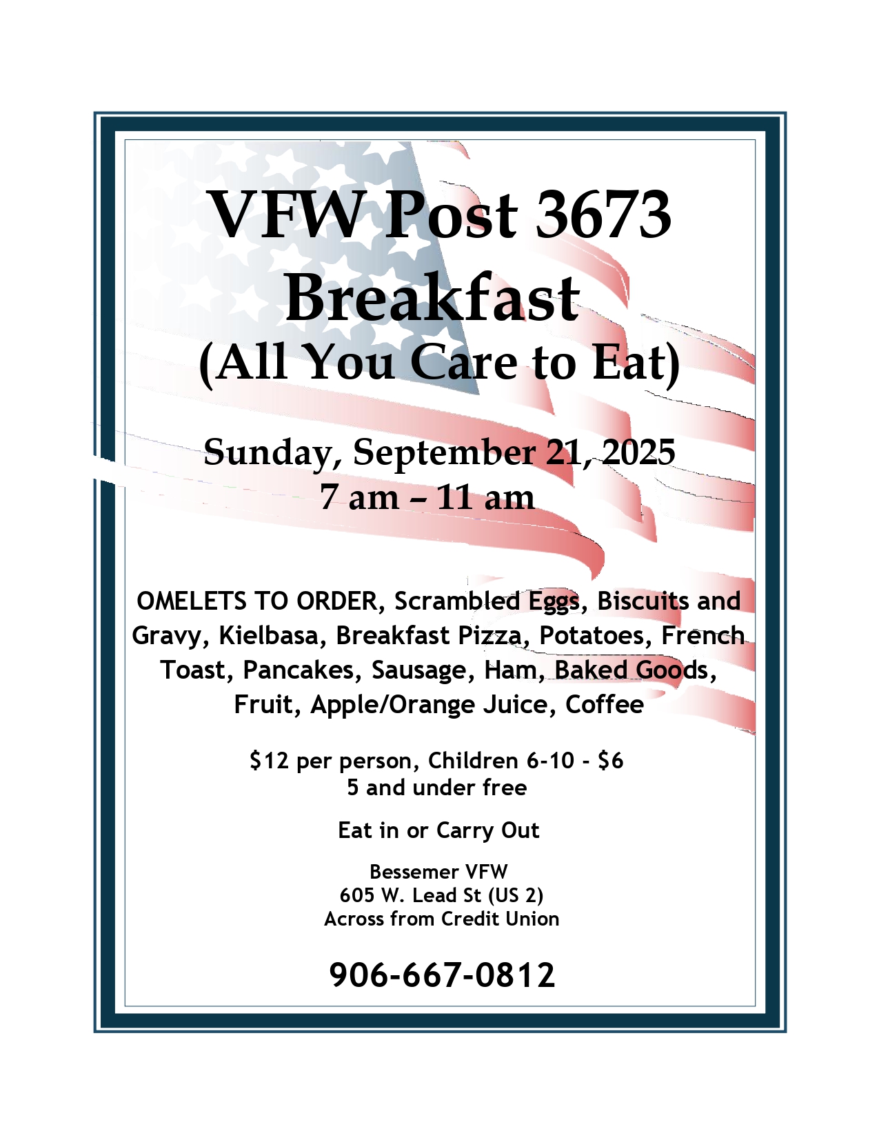 Enjoy a delicious all you care to eat breakfast buffet on Sunday, September 21st from 7 – 11 AM at VFW Post 3673 in Bessemer.
