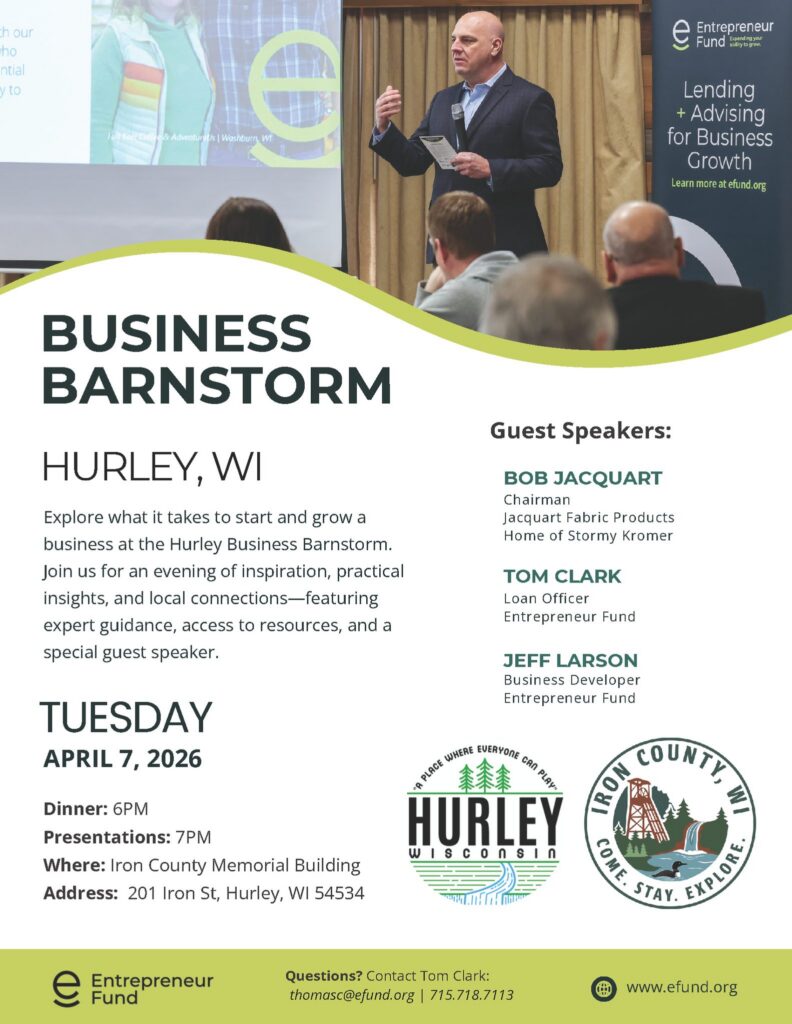 This event is a joint initiative by the Entrepreneur Fund, Hurley Area Chamber of Commerce, and the Iron County Economic Development Committee to support local business growth.