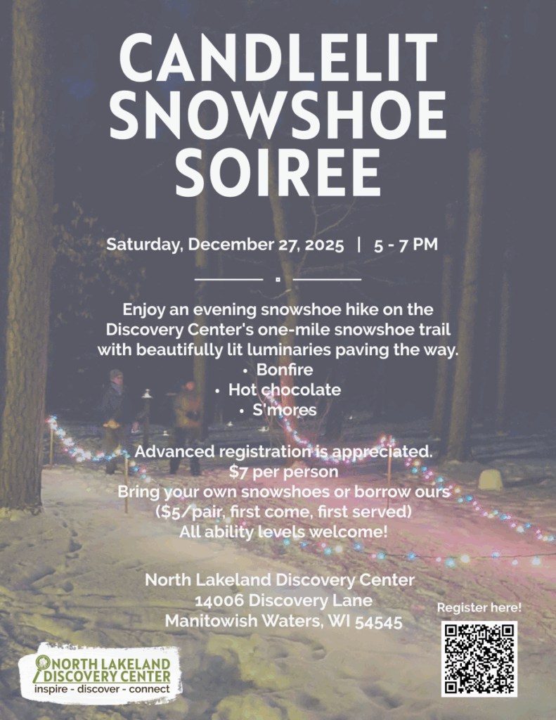 North Lakeland Discovery Center is hosting a Candlelit Snowshoe Soiree on Saturday, December 27th from 5 – 7 pm.