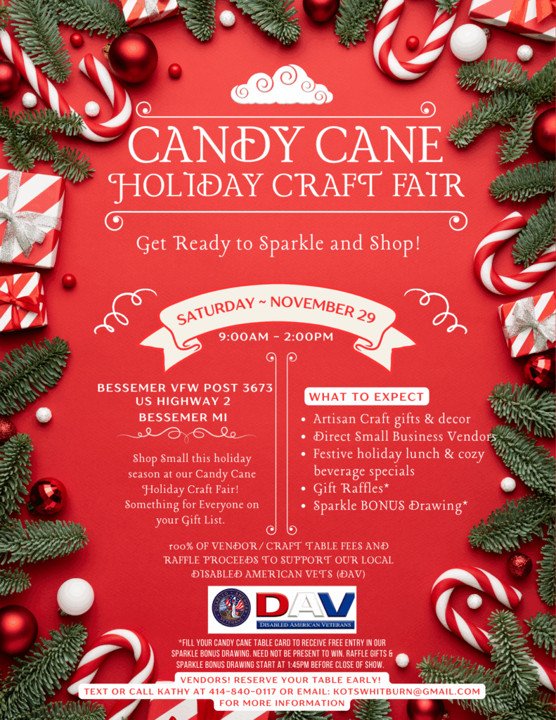 Need not be present to win raffles or Sparkle Bonus Drawing. 100% of all Vendor Table Fees and Raffle proceeds support and donated to our local Disabled American Vets (DAV). VENDORS can contact Kathy Whitburn via text or call 414-840-0117 or email [email protected] for information to reserve their spot. Limited space available – reserve early!