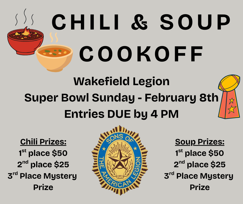 The Wakefield American Legion is hosting a soup and chili cookoff on Super Bowl Sunday, February 8th.
