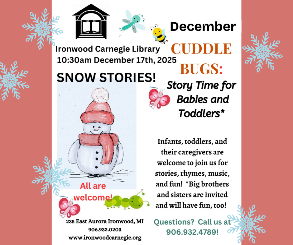Join the Ironwood Carnegie Library for Cuddle Bugs Story Time on Wednesday, December 17th at 10:30 am.