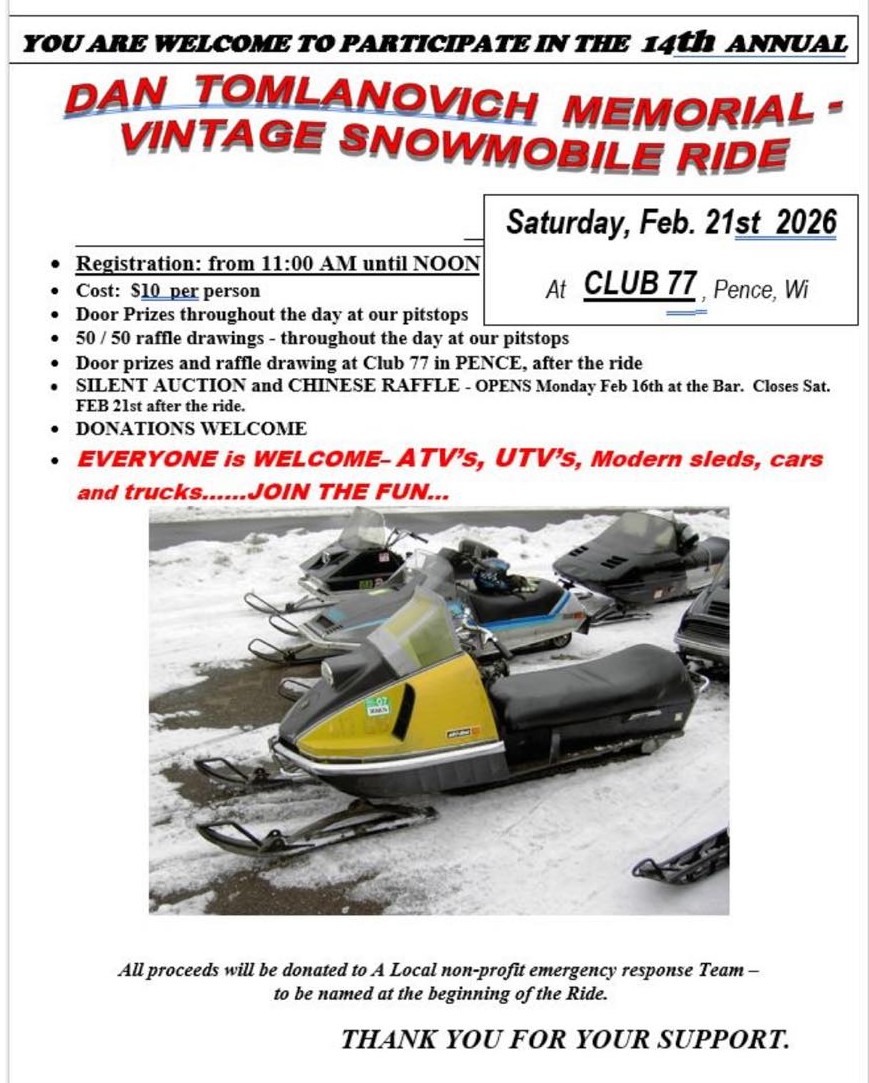 The 14th annual Dan Tomlanovich Memorial Vintage Snowmobile Ride will take place on Saturday, February 21, 2026.