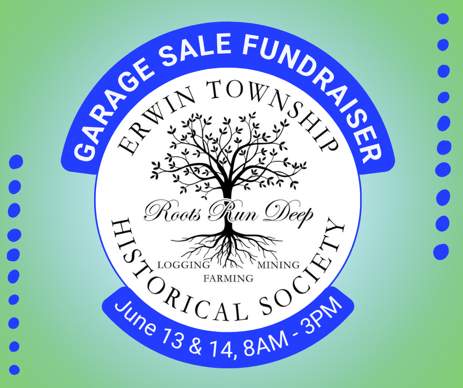 The annual Erwin Township Historical Society Garage Sale Fundraiser will be help from 8 am – 3 pm on June 13th and 14th, 2026.