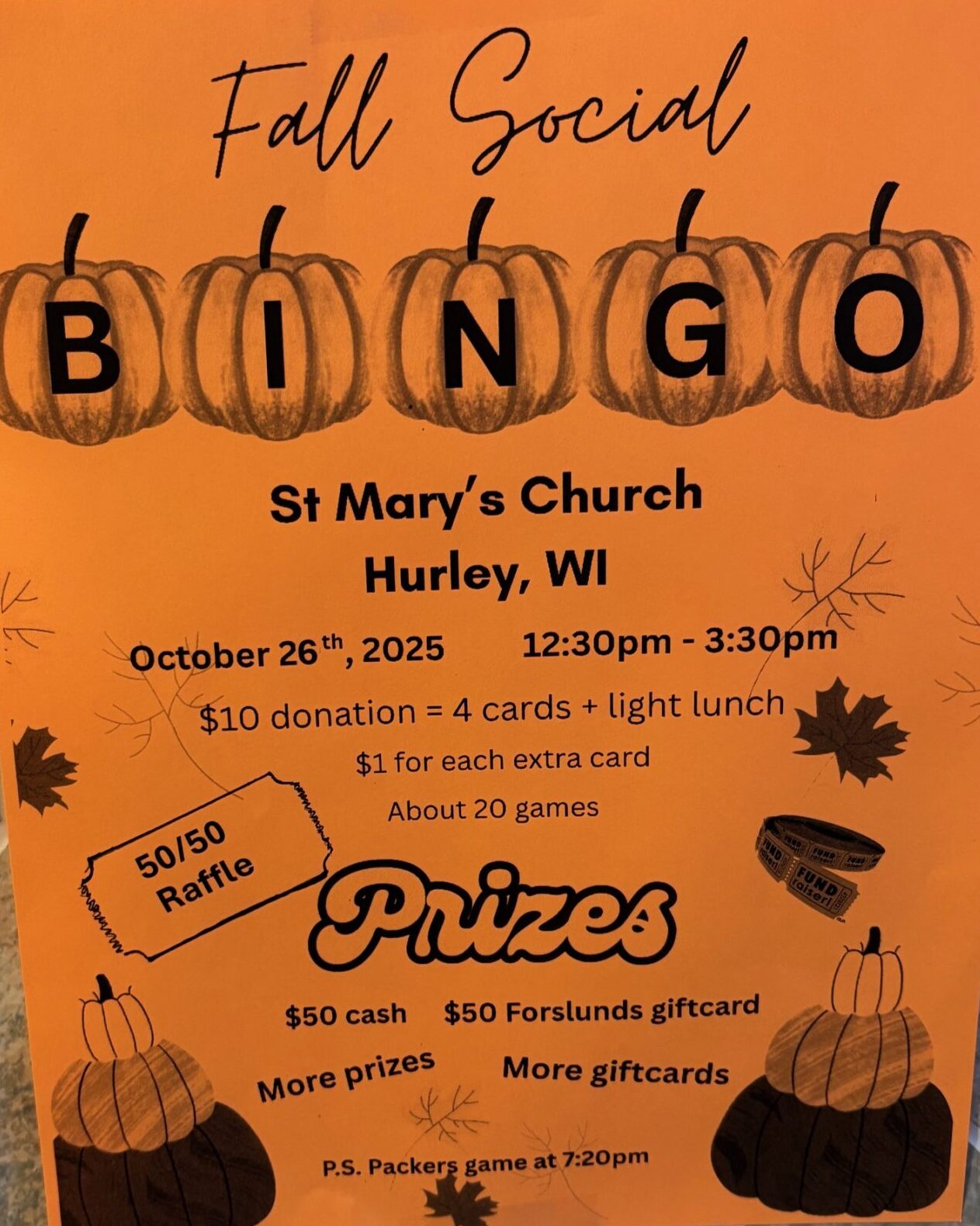 St. Mary’s Church in Hurley is hosting a Fall Social BINGO on Sunday, October 26th from 12:30 – 3:30 PM.