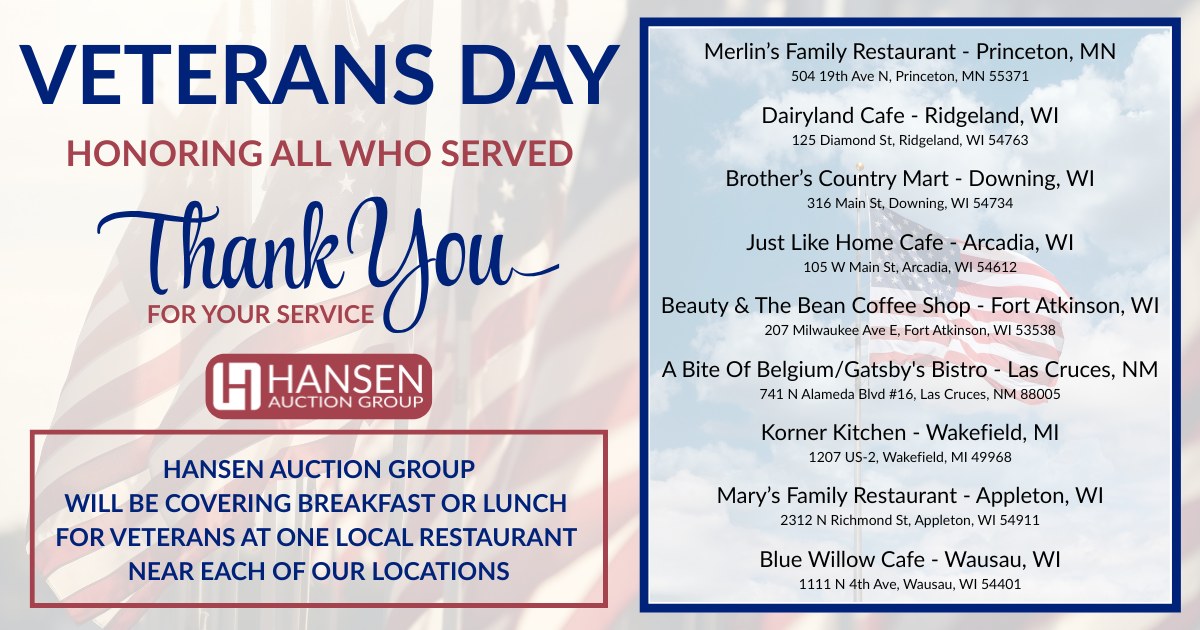 Hansen Auction Group is sponsoring a FREE BREAKFAST OR LUNCH FOR VETERANS on Tuesday, November 11th at the Korner Kitchen in Wakefield.