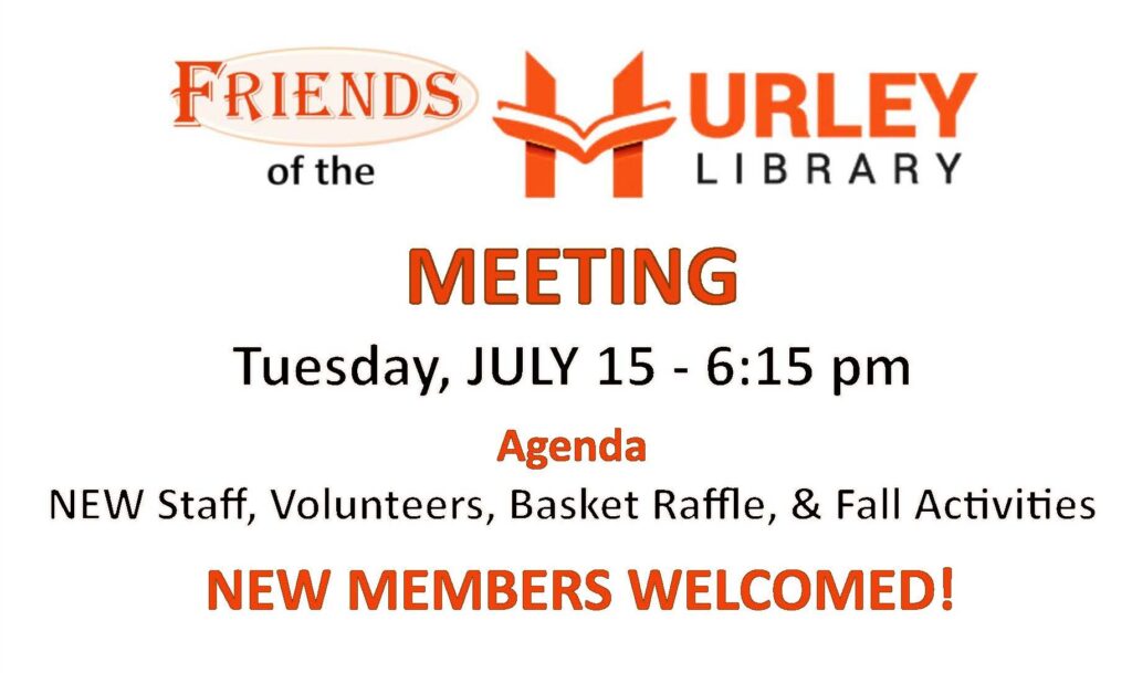 The Friends of the Hurley Library are holding their monthly meeting on Tuesday, July 15th at 6:15 PM.