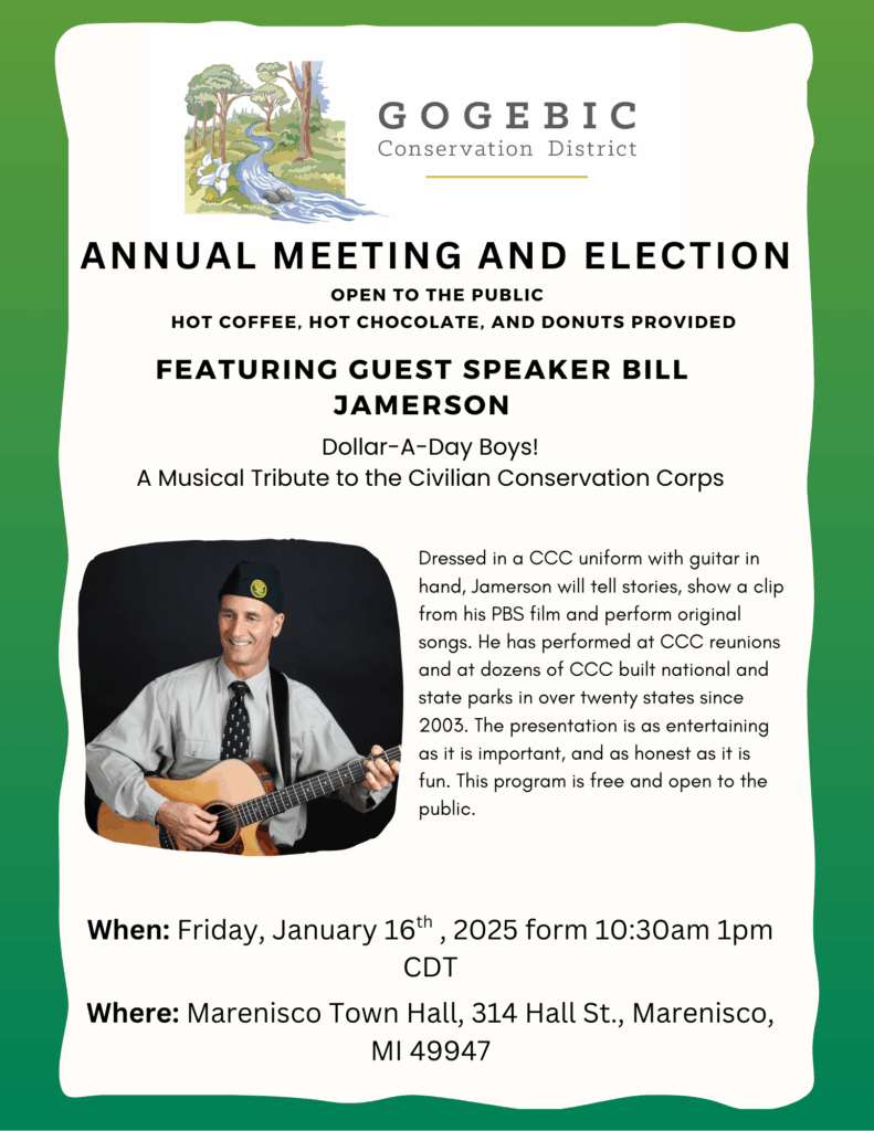 The Gogebic Conservation District Annual Meeting and Election will take place on Friday January 16th at 10:30am at the Marenisco Town Hall. The event will feature guest speaker Bill Jamerson who will be performing a musical tribute to the Civilian Conservation Corps. The event is free and open to the public. Hot coffee, hot chocolate, and donuts will be provided.