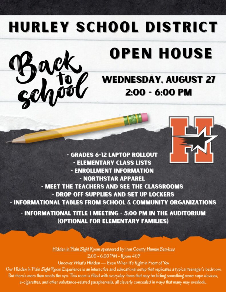 The Hurley Area School District is hosting a Back-to-School Open House on Wednesday, August 27th from 2 – 6 PM.
