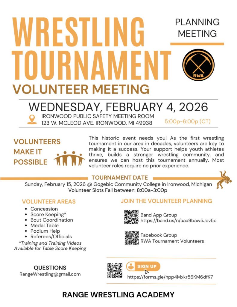 Ironwood’s own Range Wrestling Academy is hosting a local tournament on Sunday, February 15th at Gogebic Community College.
