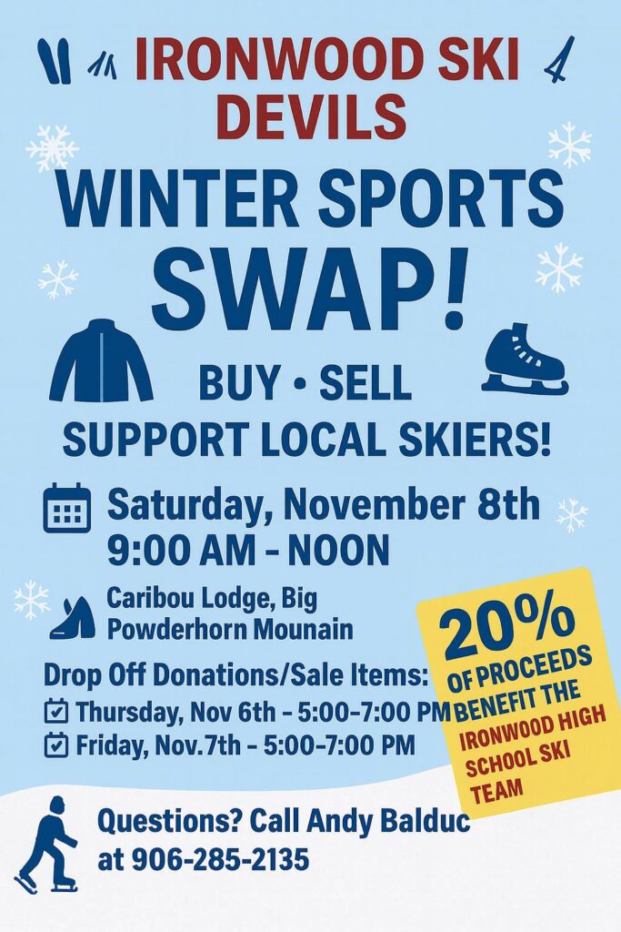 Annual ski swap to support self-funded area High School Ski team. 20% of sales go to the team.