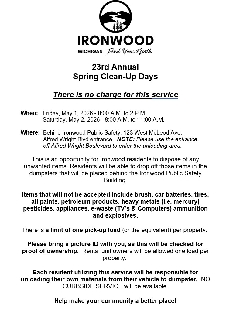 Take part in the city of Ironwood’s Spring Clean-Up Days on May 1st and 2nd.