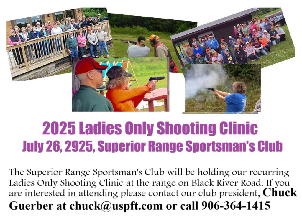 The Superior Range Sportsman’s Club will be hosting another Ladies Only Shooting Clinic, Saturday, July 26, from 9:00AM to 3:00PM, at their range on Black River Road.