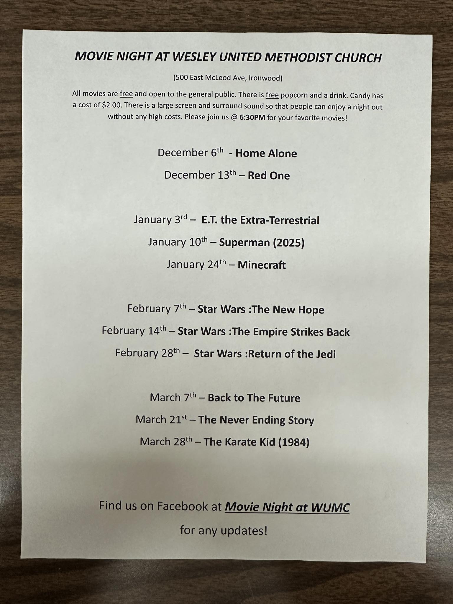 Wesley United Methodist Church is offering FREE movies on upcoming Saturday nights.