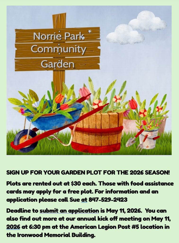 For information and an application please call Sue at 847-529-2423 or attend our annual kick=off meeting on May 11, 2026 at 6:30 pm at the American Legion Post #5 location in the Ironwood Memorial Building