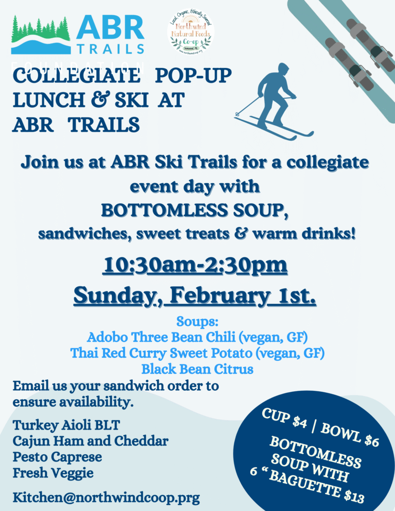 Whether you are a racer, a spectator, or just out for a day on the trails, we invite you to join Northwind Co-op at ABR Trails for bottomless soup! We’ll also have sandwiches, sweet treats and warm drinks available. We hope to see you there!