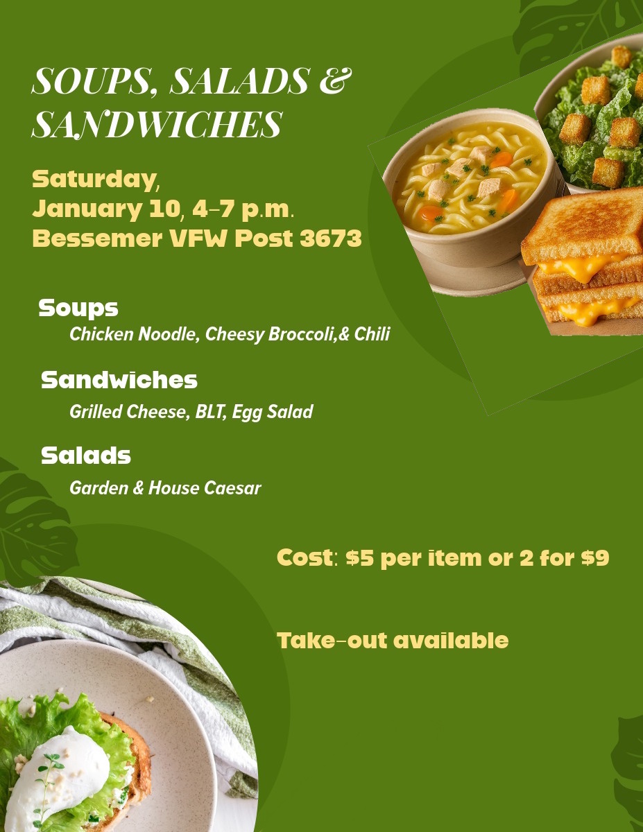 Swing in VFW post 3673 in Bessemer on Saturday, January 10th for a “make your own” dinner.