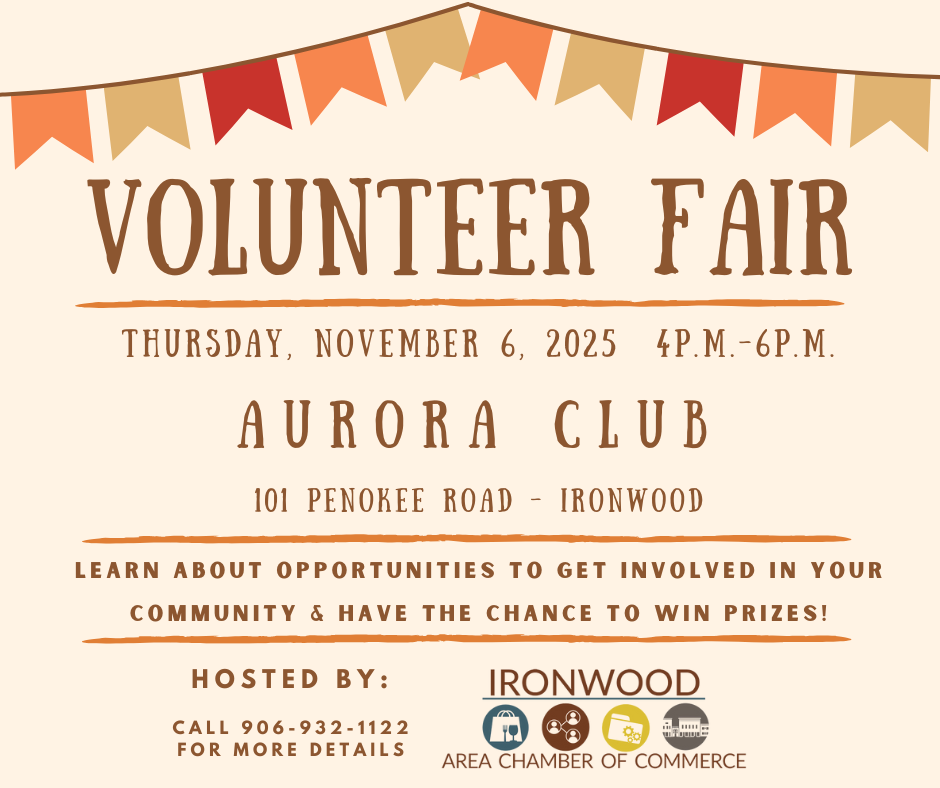 Set up a table at the VOLUNTEER FAIR sponsored by Ironwood Area Chamber of Commerce.