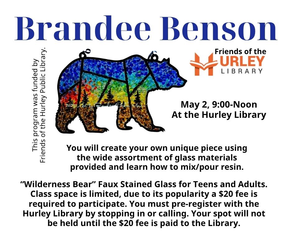“Wilderness Bear” Faux Stained Glass with Brandee Benson for teens and Adults. You will create your own unique piece using the wide assortment of glass materials provided and learn how to mix/pour resin. Class space is limited, due to its popularity a $20 fee is required to participate. You must pre-register at the Hurley Library by stopping in or calling. Your spot will not be held until the $20 fee is paid to the library.