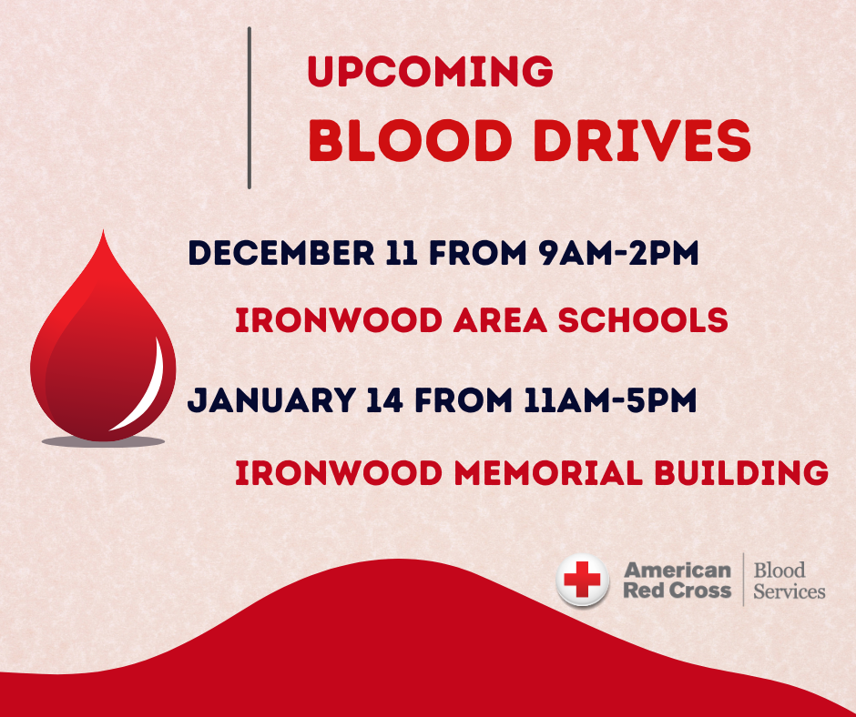 Ironwood Area K-12 Schools 650 E Ayer St, Ironwood, MIThe American Red Cross is holding blood drives at the following times and places on the flyer below. Remember that a single donation can save up to three lives!