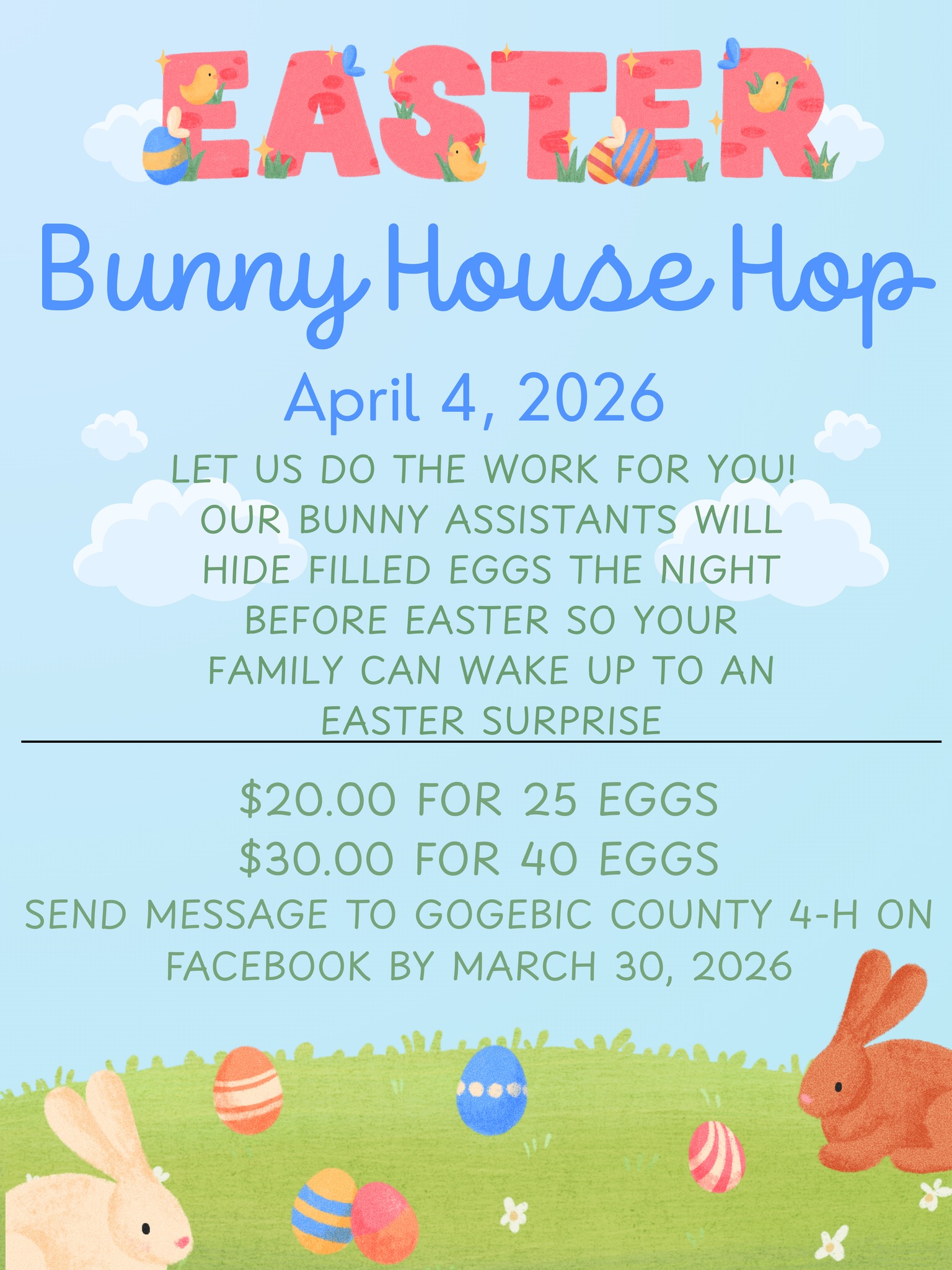 Your HouseThe Gogebic County Exploration Days Youth want to help you make Easter Eggstra special! They will hide eggs the night before Easter so your kids can wake up and find eggs around your yard. Message them today to get on their list!