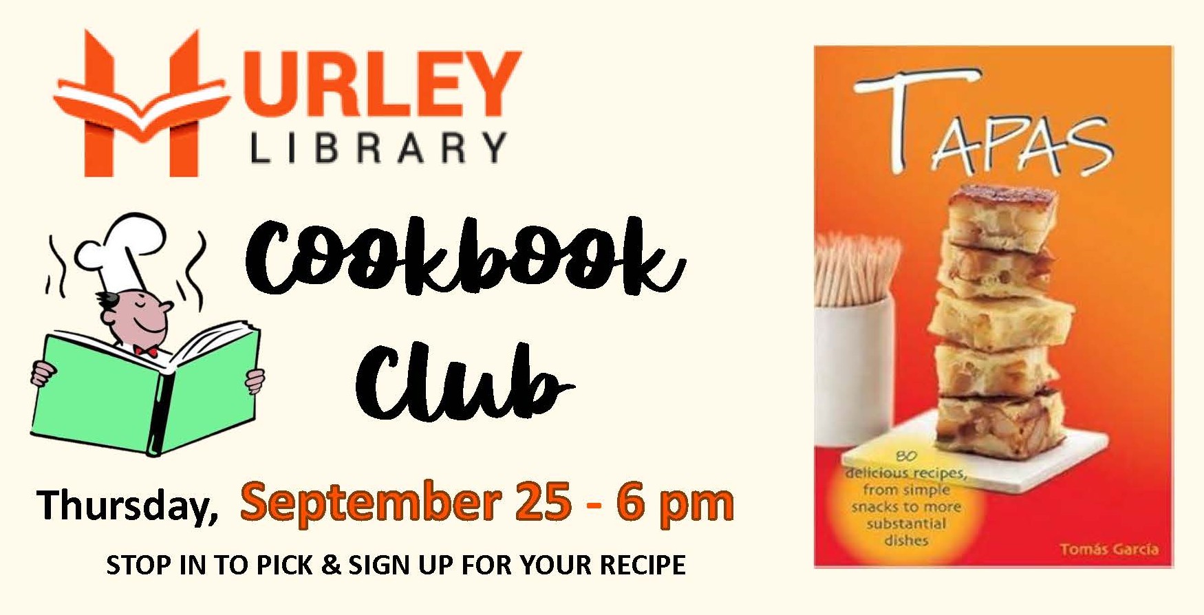 Hurley Public Library 405 5th Avenue North, Hurley, WIMake this the month you try the Cookbook Club at the Hurley Public Library. Stop in to the library and pick out a TAPAS recipe for this month's meeting. Prepare it and bring it to the meeting on September 25th at 6 PM. It's that easy!