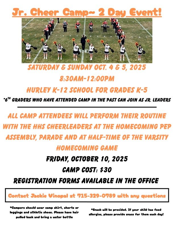 Hurley School District 5503 W. Rangeview Road, Hurley, WICalling all future Northstar Cheerleaders. You are invited to attend a 2-day cheer camp from 8:30 am - 12 NOON on Saturday, October 4th and Sunday October 5th. The routine learned in camp will be performed at the pep rally and Homecoming football game the following week. Additional details are on the flyer below.