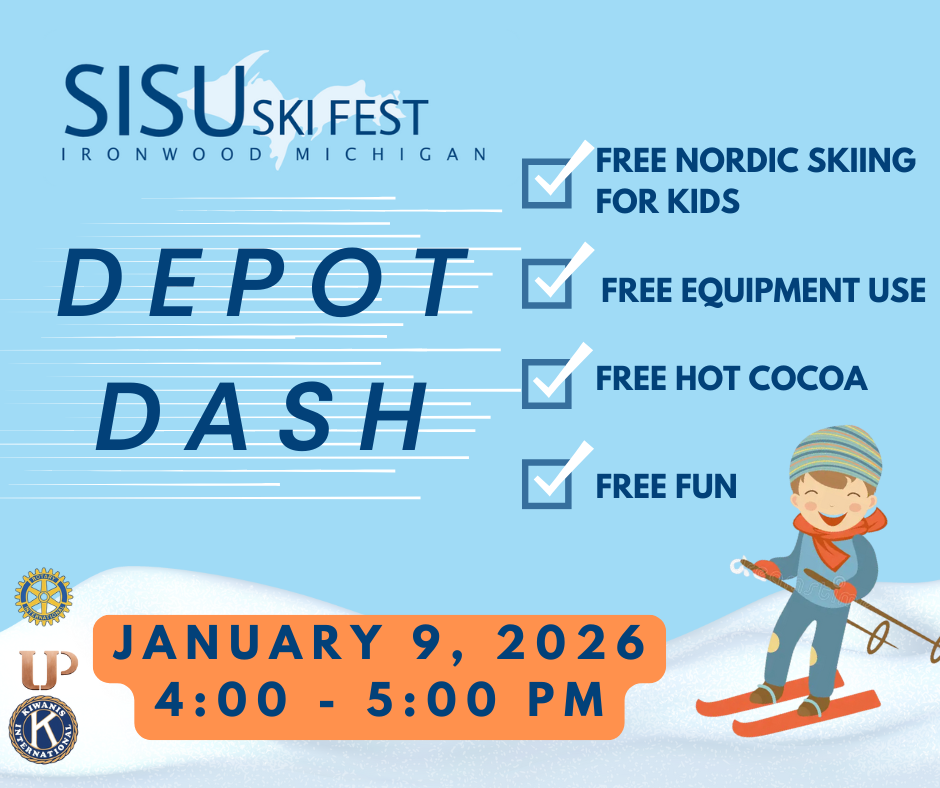 Historic Ironwood Depot Park 150 North Lowell Street, Ironwood, MISISI Ski Fest invites kids 10 and under to join them for the Annual Depot Dash. The 2026 Depot Dash will take place on Friday, January 9th from 4-5 PM in Depot Park in downtown Ironwood. Trails have been recently groomed, the snow is looking good, and fun will be had!