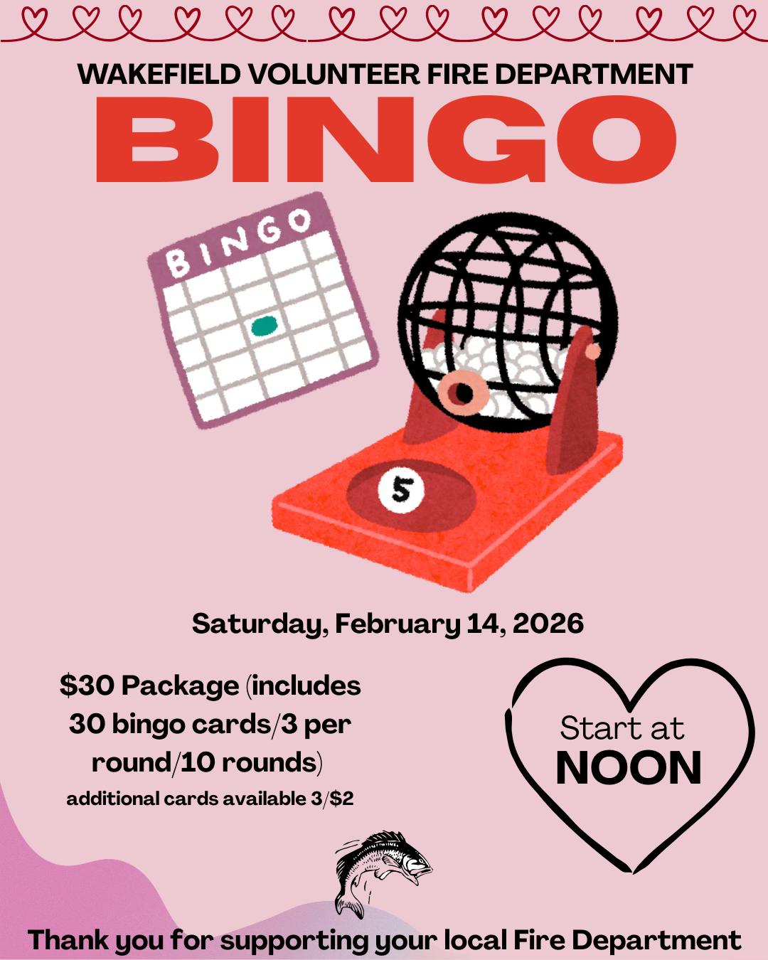 Support the Wakefield Volunteer Fire Department by playing BINGO! They are hosting a BINGO event at the Wakefield VFW on Saturday, February 14th beginning at 12 NOON. See the flyer below for additional information.