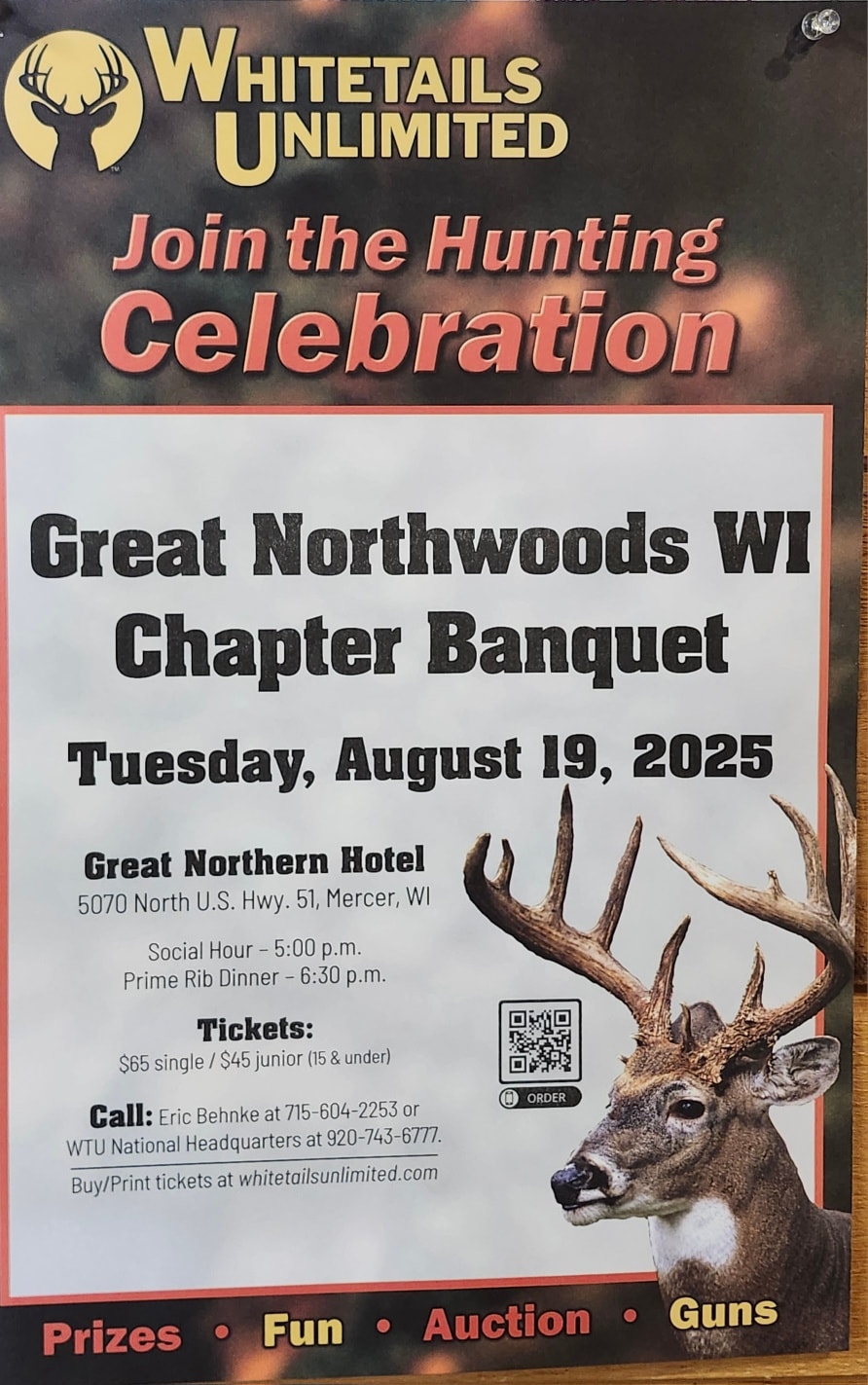 Great Northern Hotel & Wolf's Den Bar & Grill 5070 U.S. Highway 51, Mercer, WIRegistration for the annual Whitetail Banquet is now open. This event takes place at the Great Northern Hotel in Mercer and sells out every year so please get your tickets as soon as possible. Social Hour begins at 5:00 pm and dinner begins at 6:30 pm on Tuesday, August 19, 2025. This event comes with […]