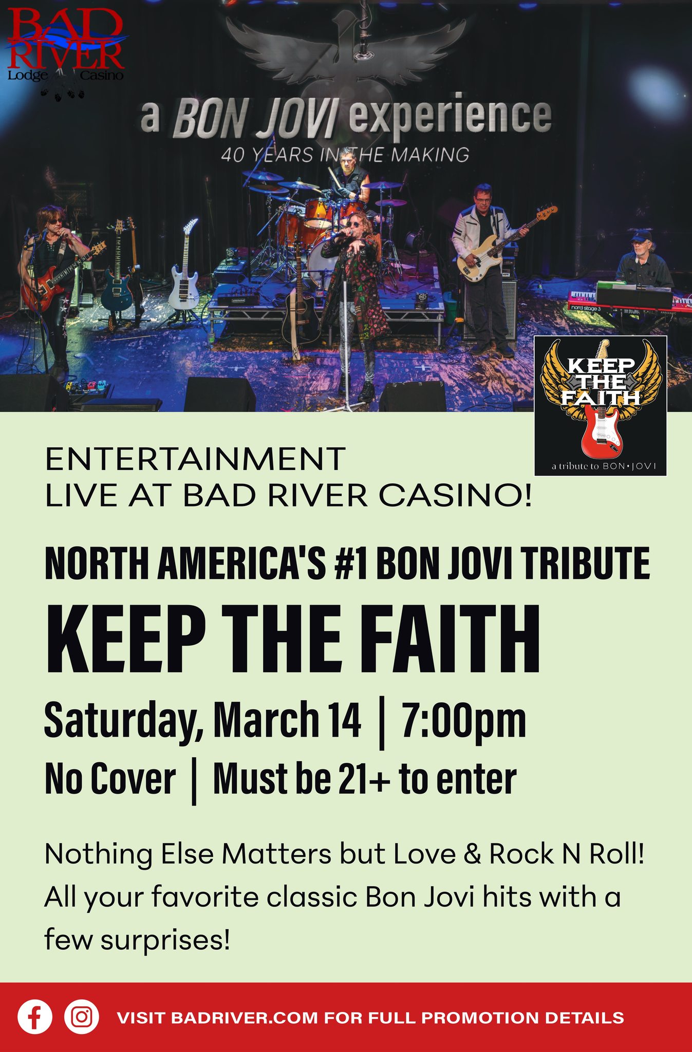 Bad River Lodge and Casino 73370 Maple Street, Odanah, WisconsinGet ready to rock with North America’s #1 Bon Jovi tribute band — KEEP THE FAITH Saturday, March 14 7:00 PM Bad River Casino NO COVER Must be 21+ to enter