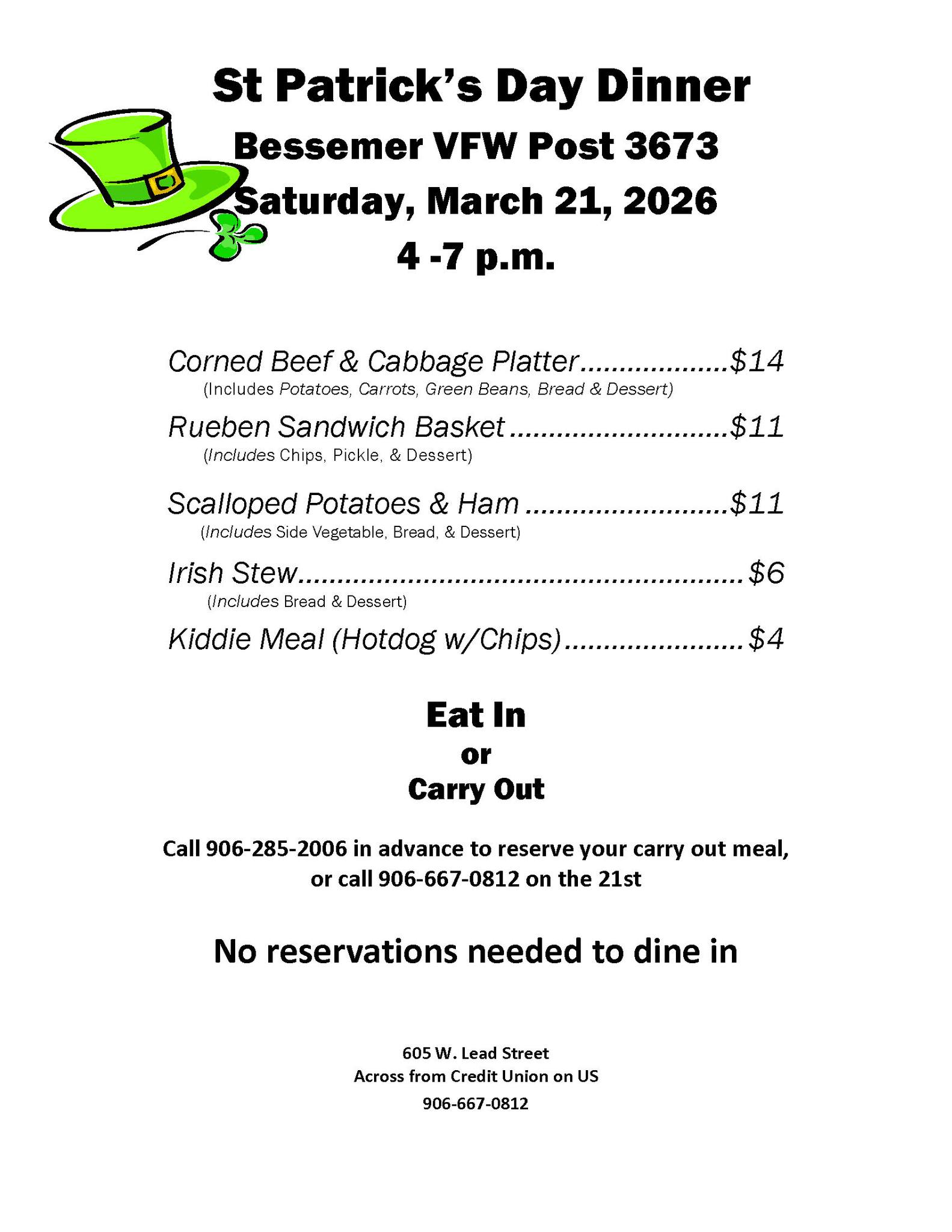 Bessemer VFW Post 3673 605 W Lead St, Bessemer, MIKeep the Irish spirit going and join in for a delicious meal! VFW Post 3673 in Bessemer is hosting their annual St. Patrick's Day dinner on Saturday, March 21st between 4 and 7 PM. Dinner is available for dine-in or take-out. See the flyer below for additional information.