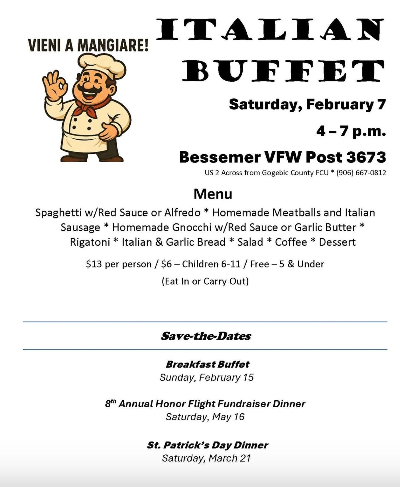 Bessemer VFW Post 3673 605 W Lead St, Bessemer, MIIt's always an incredible meal at VFW Post 3673 in Bessemer. Take advantage of their Italian Buffet on Saturday, February 7th from 4 - 7 PM. This is available as eat - in or carry - out. The cost is $13 for adults, $6 for kids ages 6 - 11, and FREE for kids 5 […]