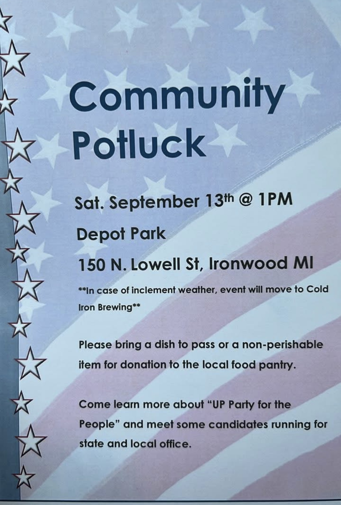 Depot Park 150 North Lowell Street, Ironwood, MICome learn more about “Party for the People” and meet some candidates running for local and state office. **In case of inclement weather, event will be moved to Cold Iron Brewing** Screenshot