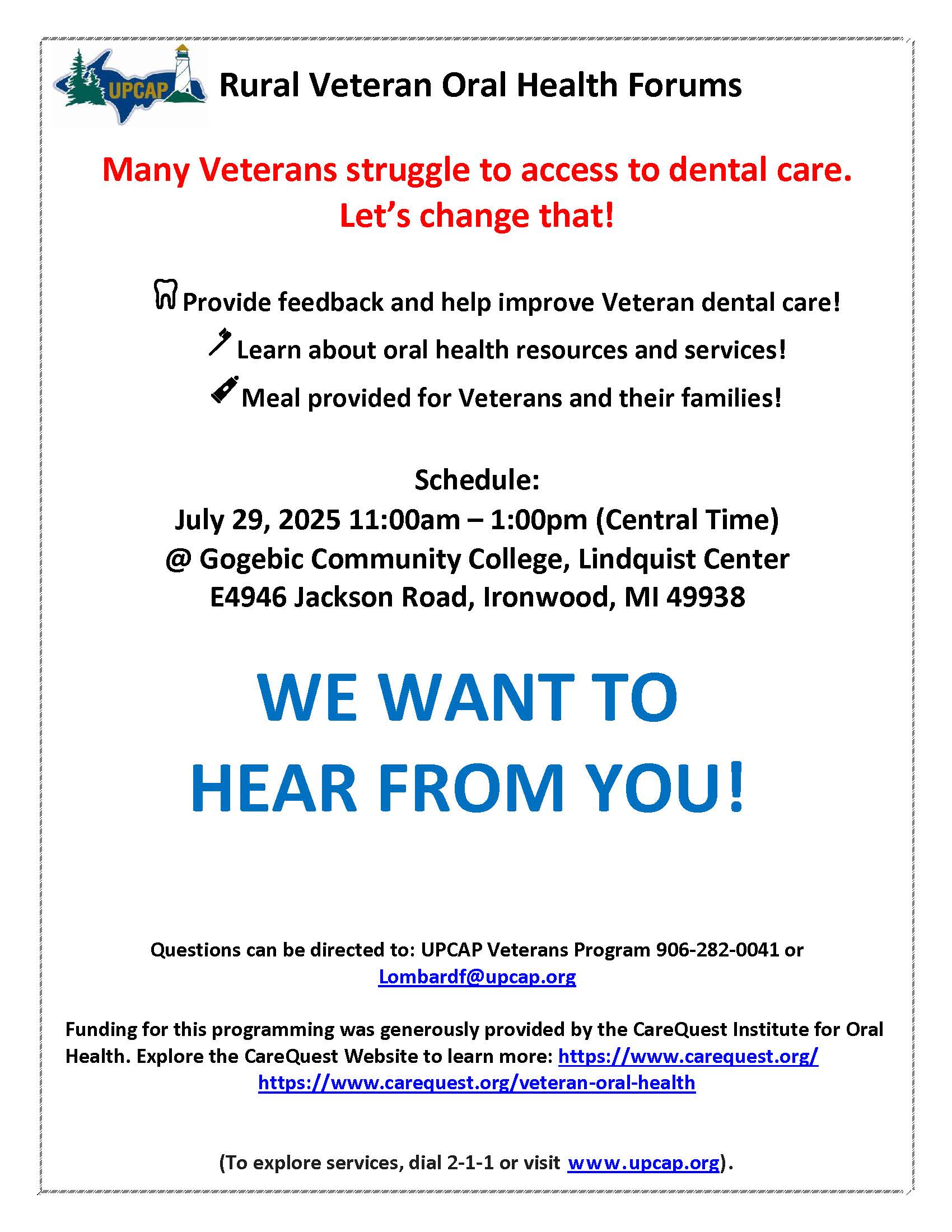 UPCAP Veteran Oral Health Forum Tuesday, July 29 11am- 1pm at Gogebic Community College