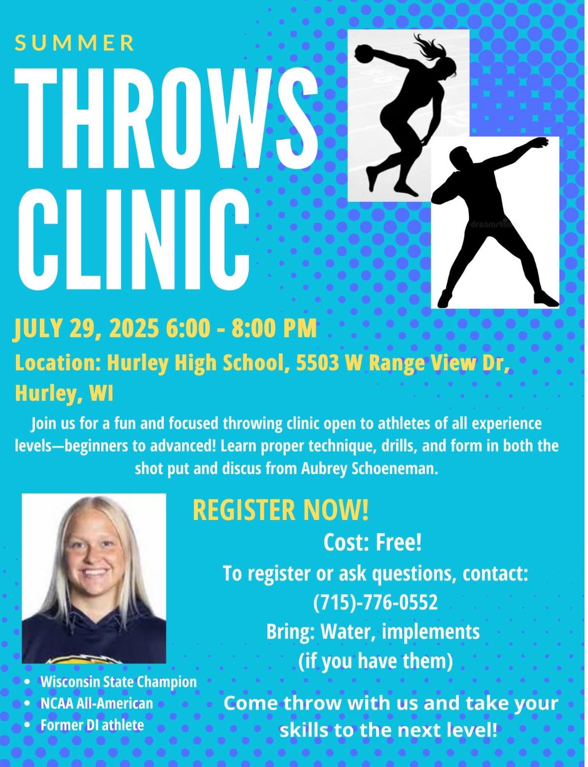 Hurley High School 5503 W. Range View Drive, Hurley, WIHere's a great opportunity for throwers to take their track and field game to the next level. On Tuesday, July 29, Aubrey Schoeneman is offering a FREE clinic at Hurley High School from 6 - 8 pm. All skill levels are encouraged to attend. See the flyer below for registration information.