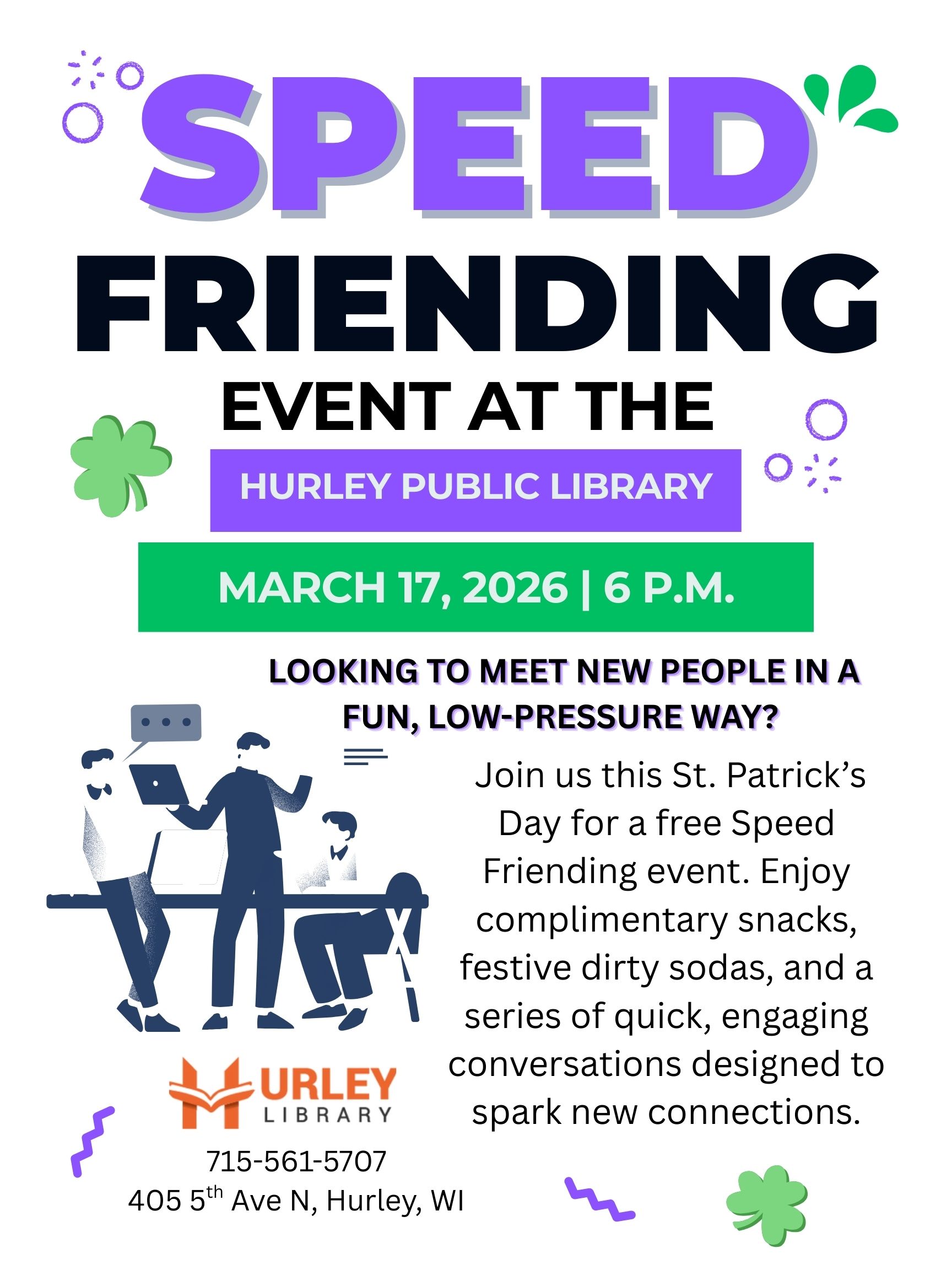 Hurley Public Library 405 5th Avenue North, Hurley, WICelebrate St. Patrick’s Day (or St. Urho) in a fun and relaxed way by meeting new people at our Speed Friending Night! Guests will rotate through a series of short, timed conversations, giving everyone the chance to meet multiple new people throughout the evening. Enjoy festive snacks, complimentary dirty sodas, and a series of quick, […]