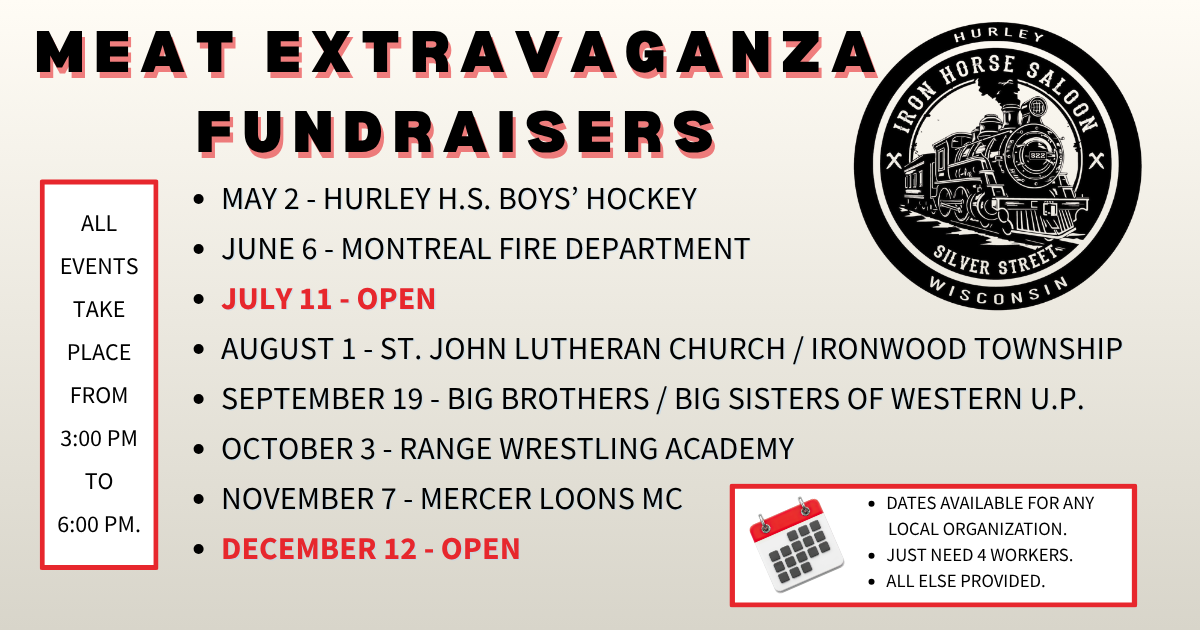 Iron Horse Saloon 322 Silver Street, Hurley, WIIron Horse Saloon in Hurley offers local organizations the opportunity to host their Meat Extravaganza fundraiser at their location. Local groups simply need to request a date and supply at least 4 workers for the event. See the calendar below for upcoming events.