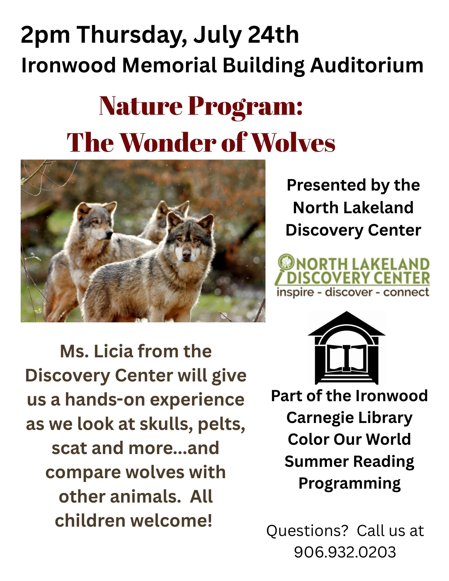 Ironwood Memorial Building 213 S Marquette St, Ironwood, MINorth Lakeland Discovery is presenting The Wonder of Wolves program at the Ironwood Memorial Building on Thursday, July 24th at 2 PM. This presentation is a part of the Ironwood Carnegie Library's Summer Reading Programming.