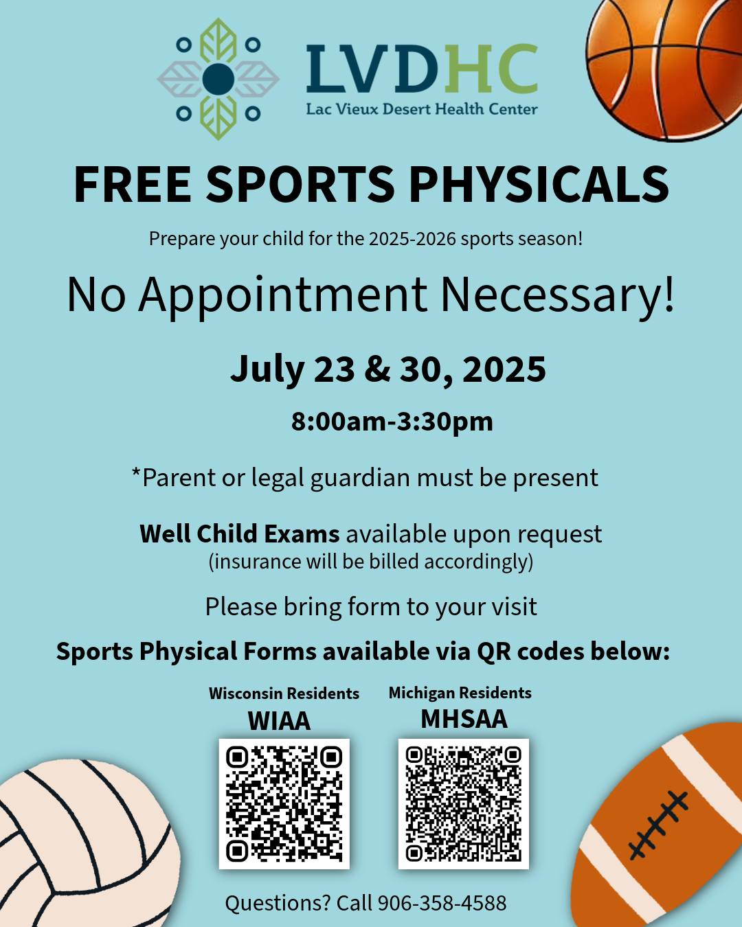 Lac Vieux Desert Health Center N5241 US HWY 45, Watersmeet, MIThe Lac Vieux Desert Health Center in Watersmeet is offering FREE SPORTS PHYSICALS for the 2025-2026 athletic season. These are being offered from 8 AM - 3:30 PM on July 23 and July 30th. Sports forms are available by scanning the QR code below. Be sure to correctly select either Wisconsin or Michigan.