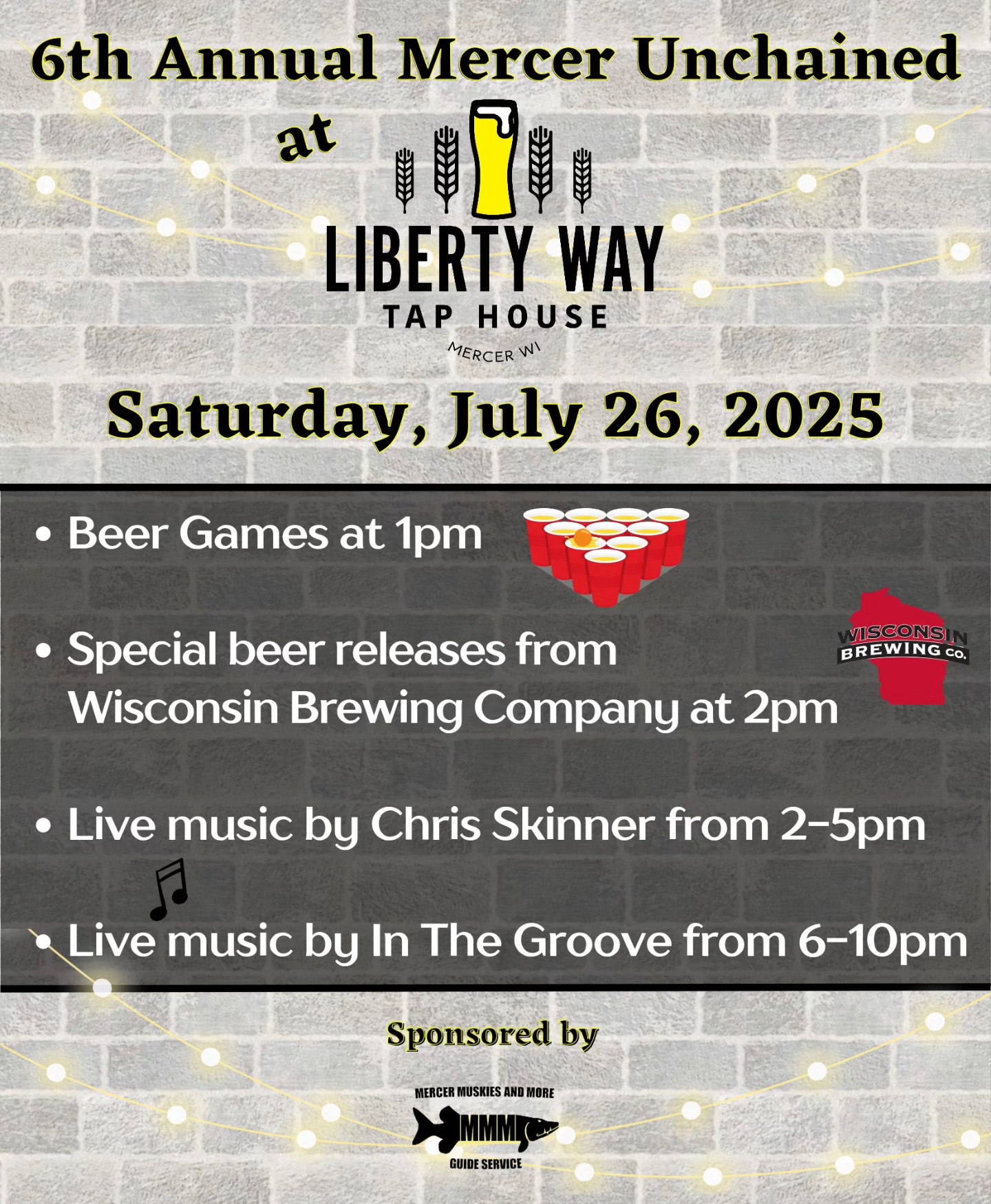 Liberty Way Tap House 2040W Saarnio Road, Mercer, WIFrom 1 - 10 pm on July 26th, Liberty Way Tap House is the place to be! Stop in for game, music and MORE! See the flyer below for all the details!