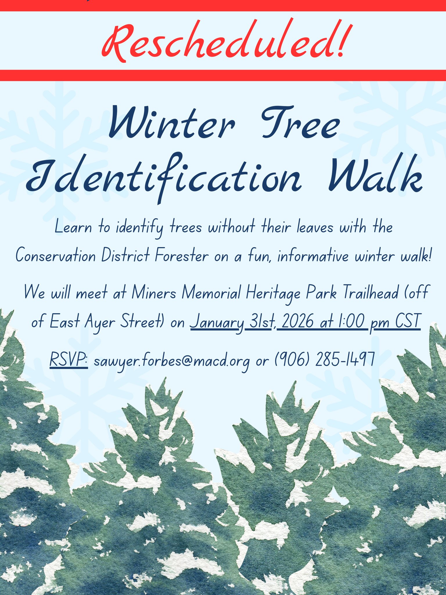 Miners Memorial Heritage Park 775 E Ayer St, IronwoodJoin the Gogebic Conservation District forester on a Winter Tree Identification Walk! The event will be at Miners Memorial Heritage Park on Saturday, jaunary 31st, at 1 pm CST. If you are interested in learning how to identify native trees, we would love to see you there! If you have questions or want to RSVP, […]